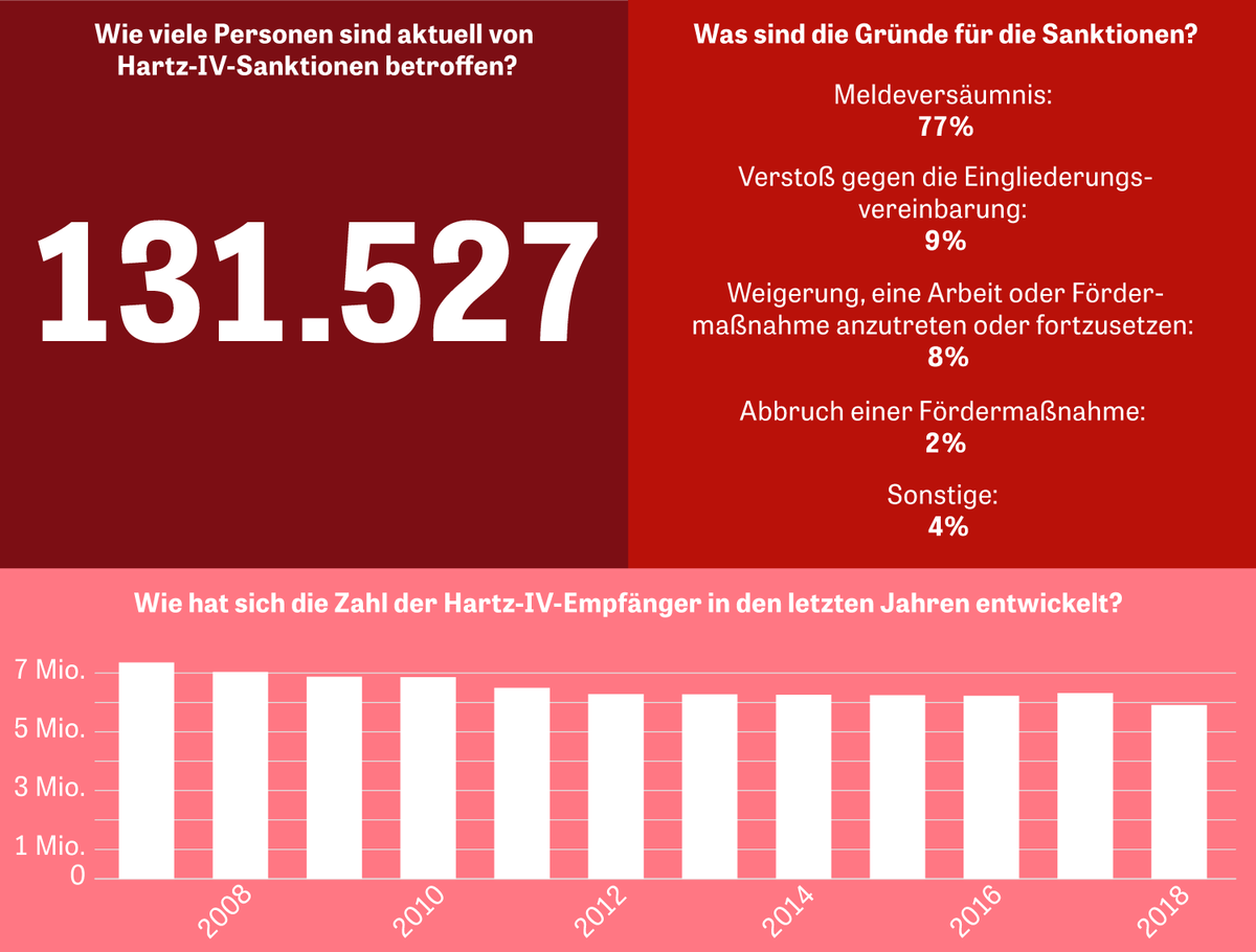 Hier artikuliert sich deutlich die Christian Lindner- oder Jens Spahn-Haltung, die allerorten anzutreffen ist. Die linksstehende Grafik veranschaulicht die Zusammenhänge zum Missbrauch von Leistungen. Der weitaus größte Anteil der Sanktionen bezieht sich auf Meldeversäumnisse, eine Grafik, auf die Rudzio selbst hinweist. Würde es ein BGE geben, gäbe es den von ihm beklagten Missbrauch gar nicht, weil ein BGE nicht mit einem bestimmten Ziel verbunden wäre. Es ist allerdings gerade Rudzios Schlussfolgerung, über die trefflich diskutiert werden kann. Denn, was folgt denn daraus, dass manche einen "äußeren Ansporn" - eine doch eher verharmlosende Formulierung für die Sanktionen - brauchen? Sind sie für private Unternehmen oder den öffentlichen Dienst interessante Mitarbeiter, wenn sie sich nicht selbst aufraffen können? Sollen sie von Unternehmen dazu erzogen werden? Unternehmen also als Erziehungsanstalten? Der Sozialstaat als Besserungsanstalt? Weshalb nicht vom Bürger aus denken, dessen Existenzminimum unverfügbar sein soll? Dann wäre denen geholfen, die partout nichts beitragen wollen, und den anderen, die beitragen wollen, ganz gleich in welcher Form, und dazu Gleichgesinnte finden können. Wer weiß, wie viel Verweigerung heute auch mit dem Sozialstaat zu tun hat, den wir haben? Leistungsfördern sind solche Sanktionen jedenfalls nicht, dem Geist der Demokratie entsprechen sie auch nicht.